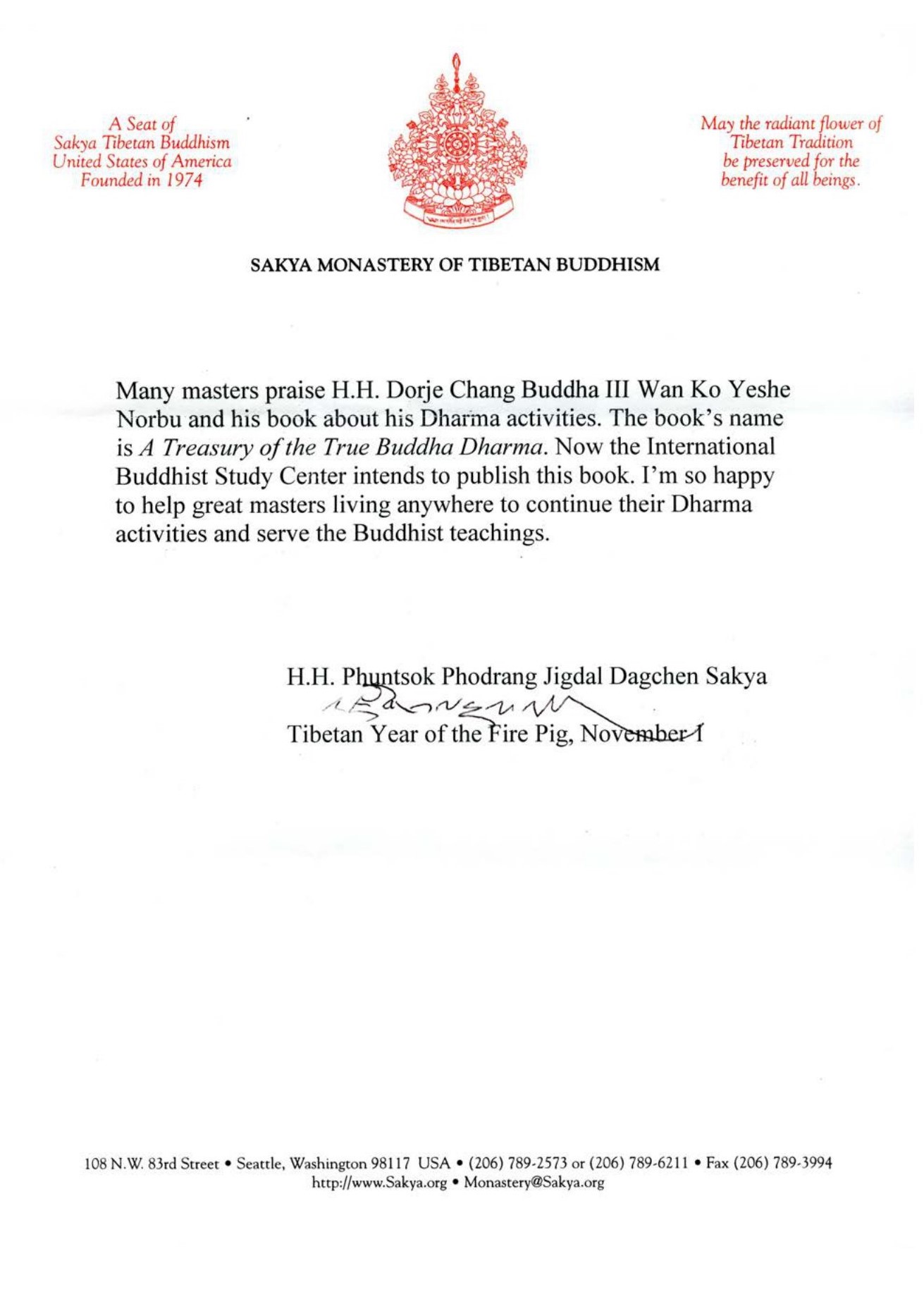 H.H. Dharma King Jigdal Dagchen Sakya is the founder and principal guru of the Sakya Monastery of Tibetan Buddhism in Seattle, Washington, U.S.A...