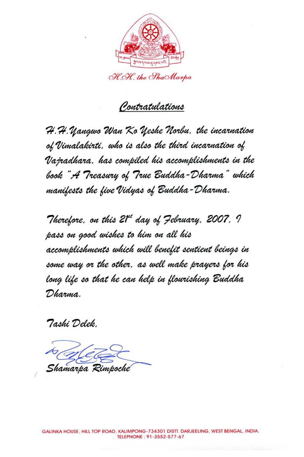 The meaning of the word Shamarpa is “a venerable one who wears the red jewel hat.” H.H. Karmapa is called the Great Jewel Dharma King who wears the black jewel hat...