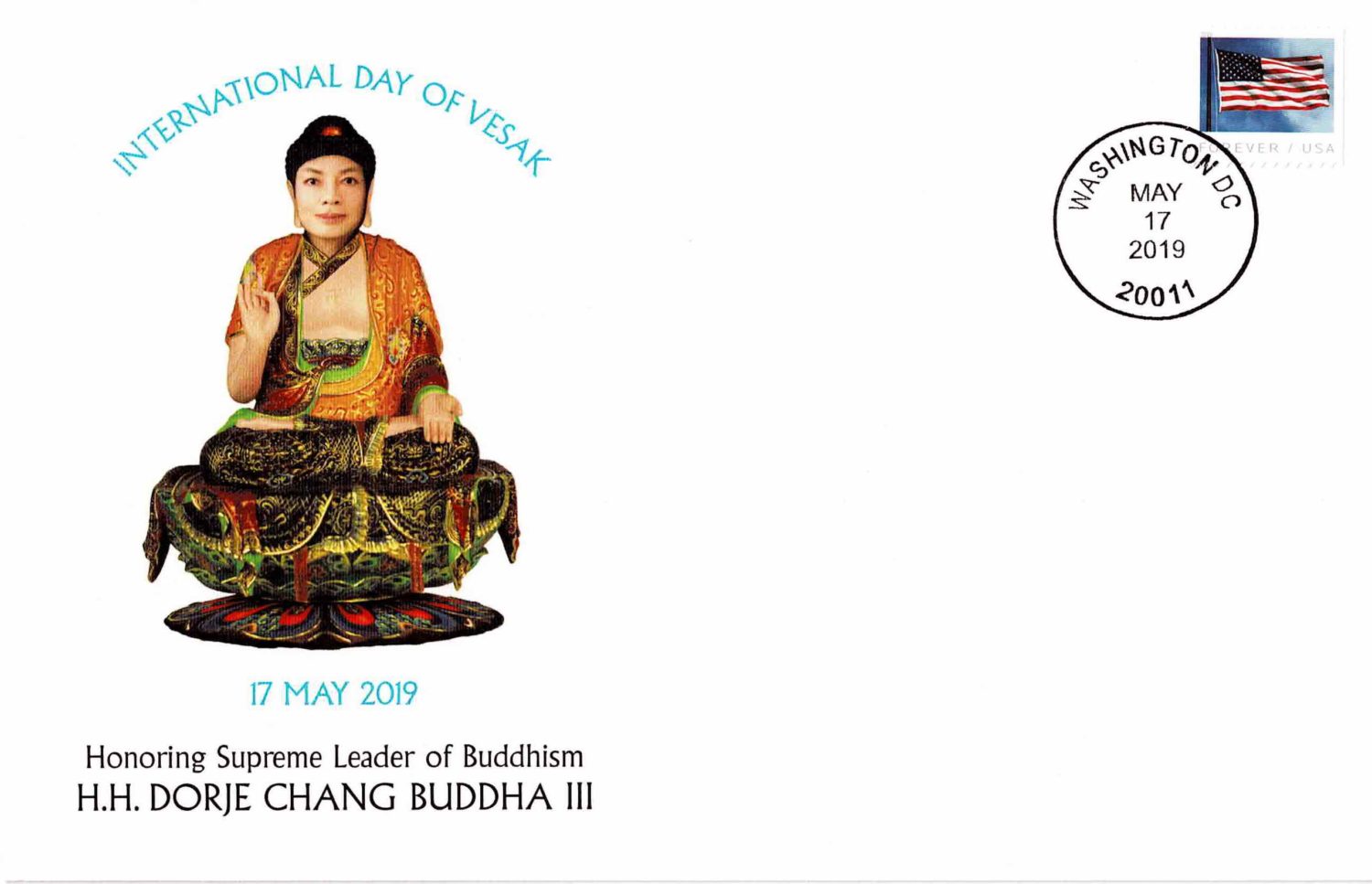 On January 19, 2012, the first anniversary of the H.H. Dorje Chang Buddha III Day, the Sino-American Philatelic Center announced the issuance of the world-limited edition, a total of only 2000 sets, of the H.H. Dorje Chang Buddha III Day first-day covers to celebrate this wonderful occasion. It is the first time in U.S. philatelic history that a first-day cover is issued in the name of Buddha.